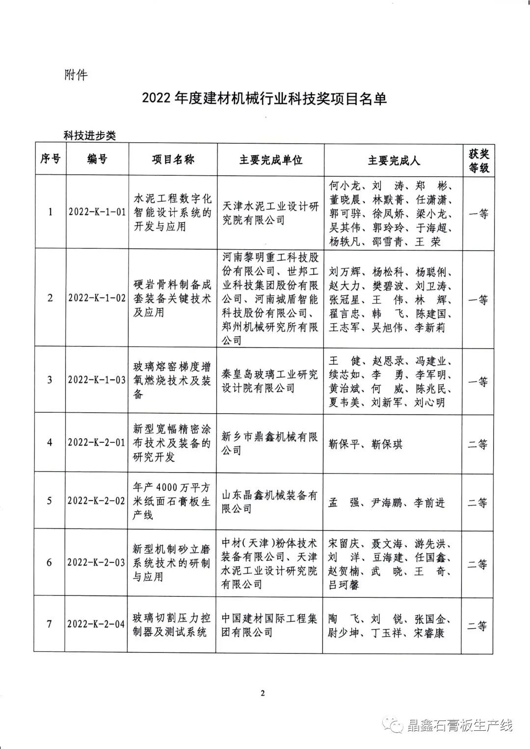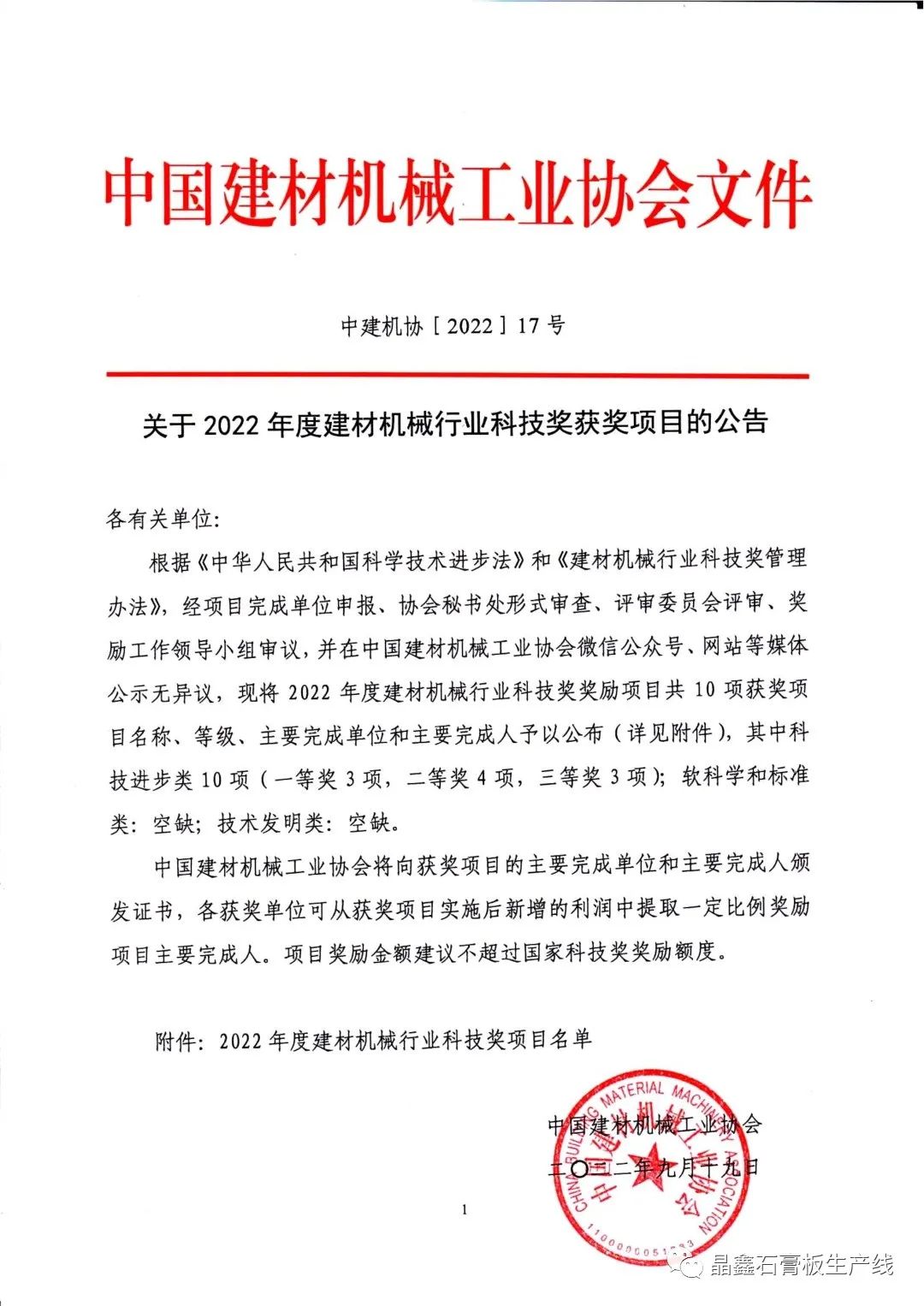 - 晶鑫公司年產(chǎn)4000萬平方米紙面石膏板生產(chǎn)線項目榮獲2022年度建材機械行業(yè)科技獎 2022-09-26